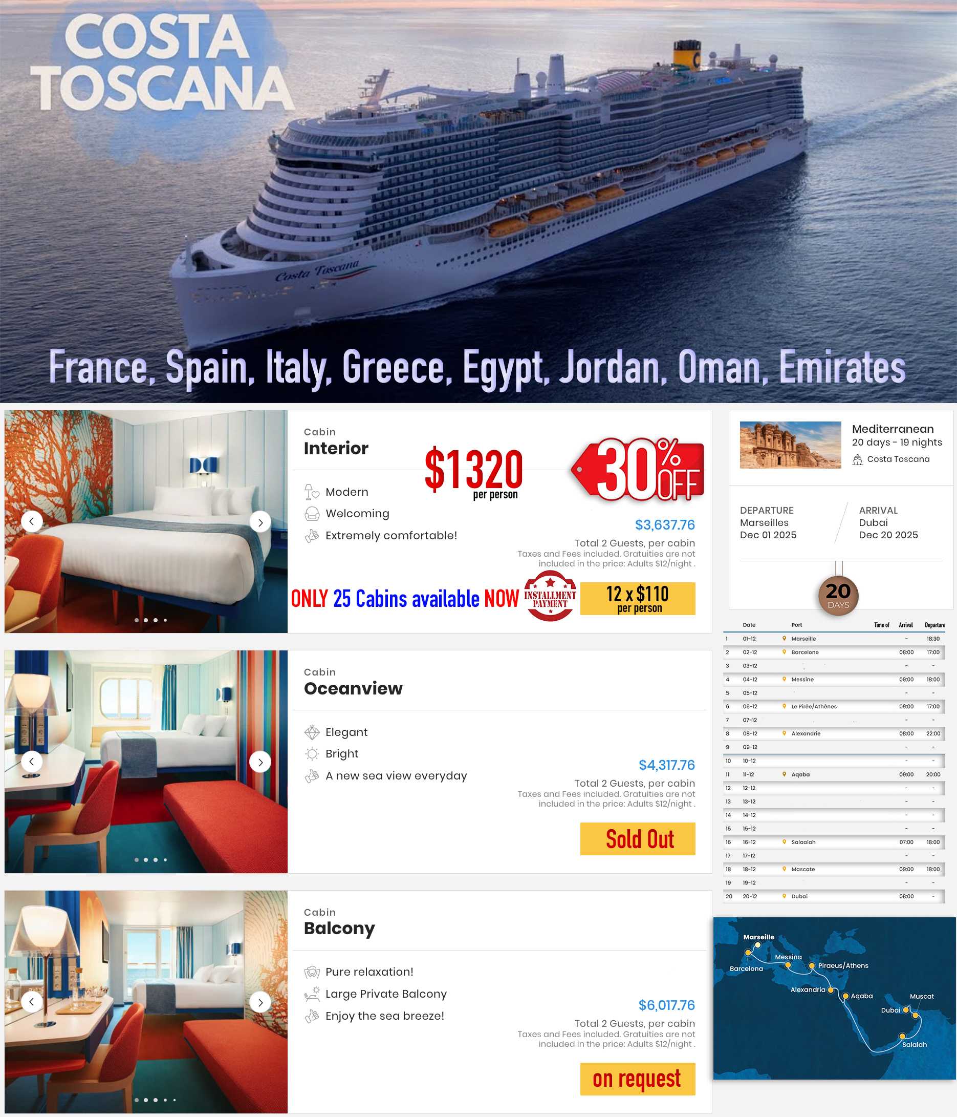 Flights, transfers, full board basis (cruise) on a double sharing, sauna, jacuzzi, casino, gym, shows, entertainment, excursions, masterclass.