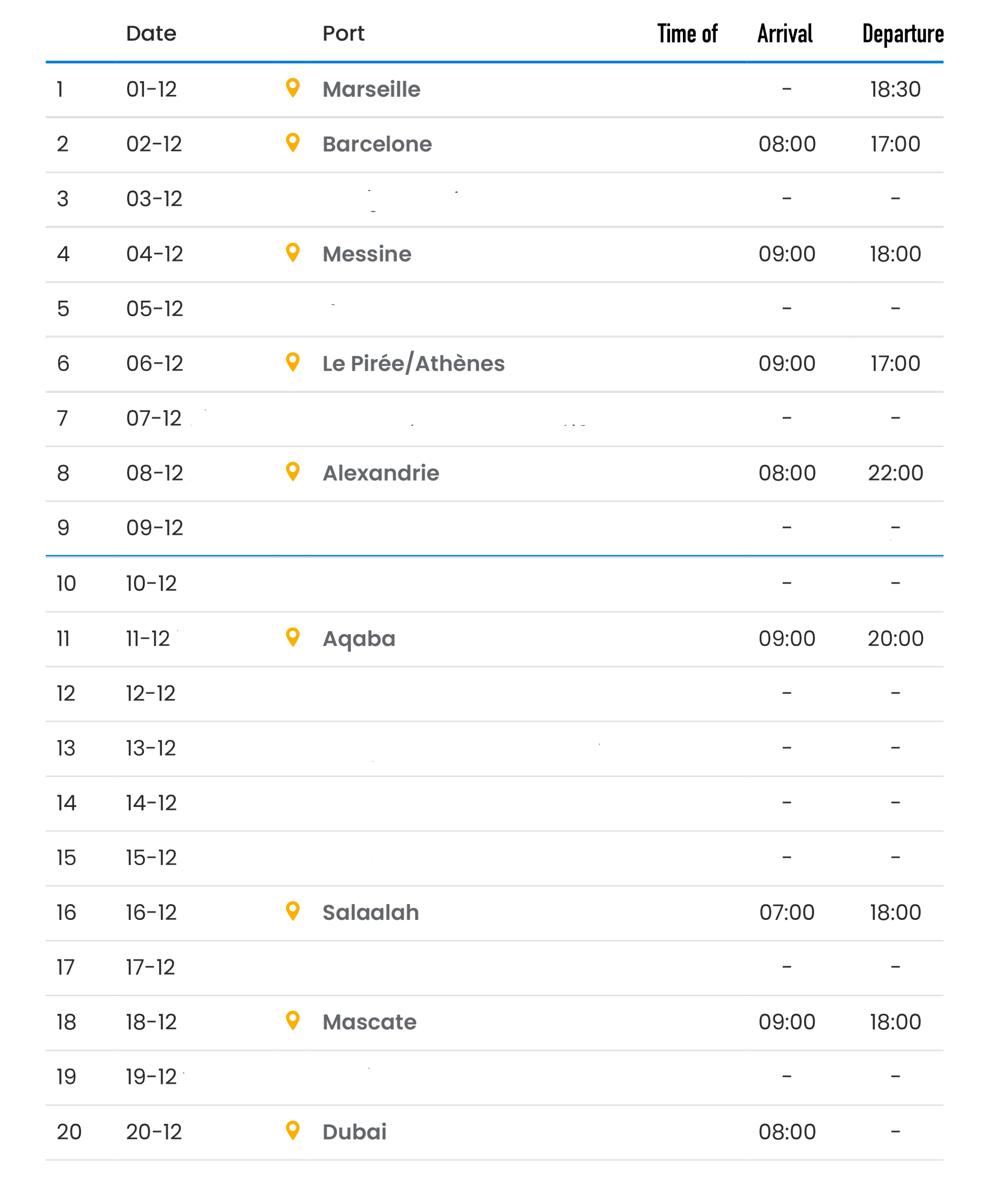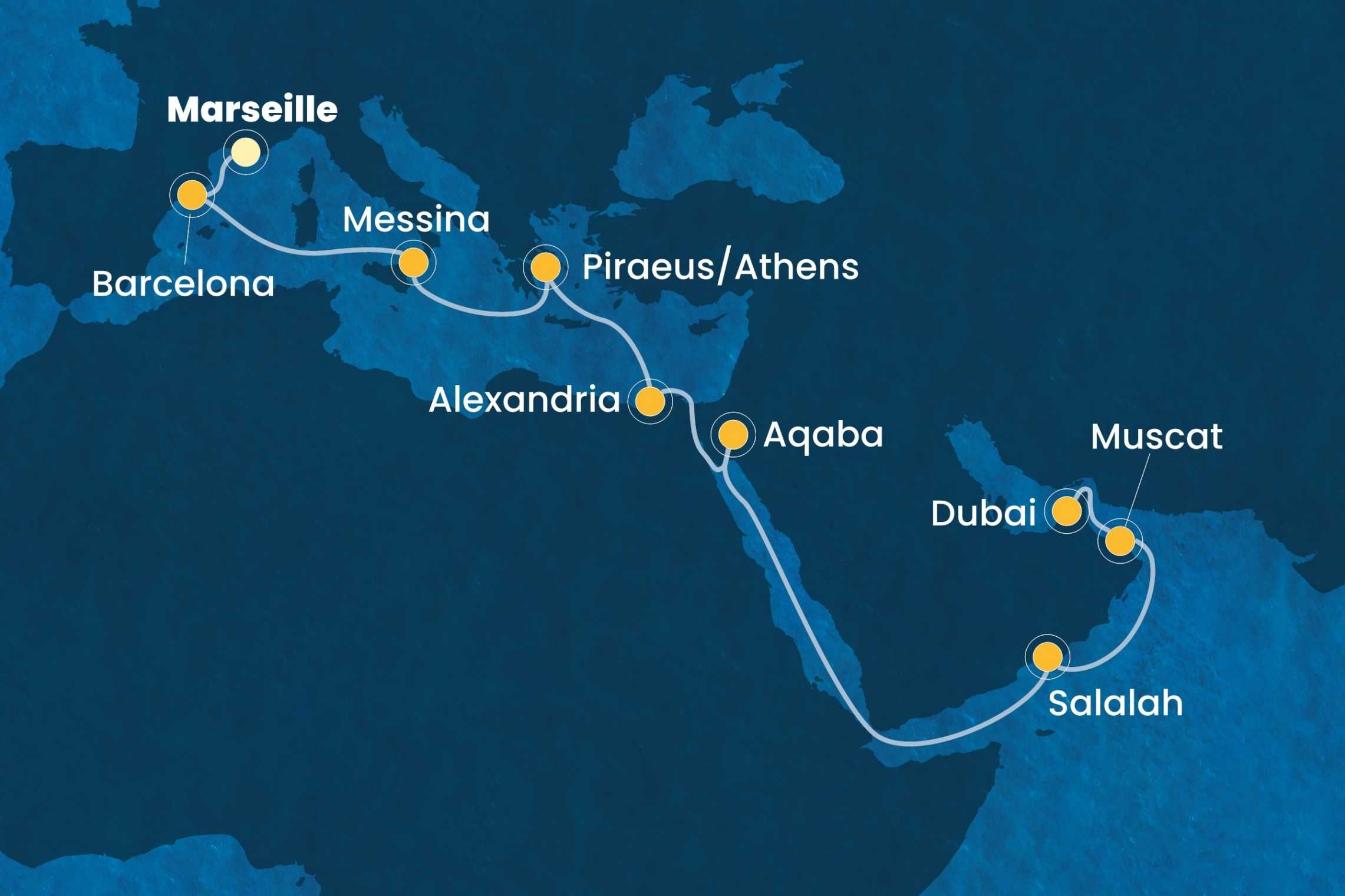 Stopovers: France, Spain, Italy, Greece, Egypt, Jordan, Oman, Emirates
